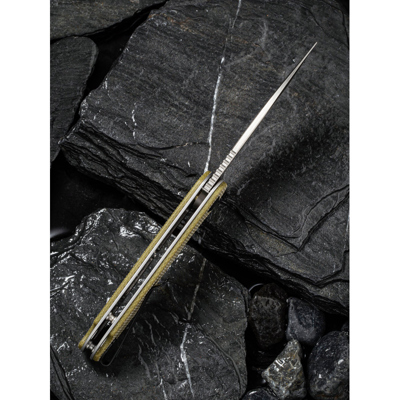 Рукоятка моделі виконана з мікарти. Це – композитний матеріал із льону та синтетичної смоли. Він виглядає чудово і гарантує достатнє зчеплення. Таким чином, керувати ножем дуже просто. Він стійкий до інтенсивних навантажень.