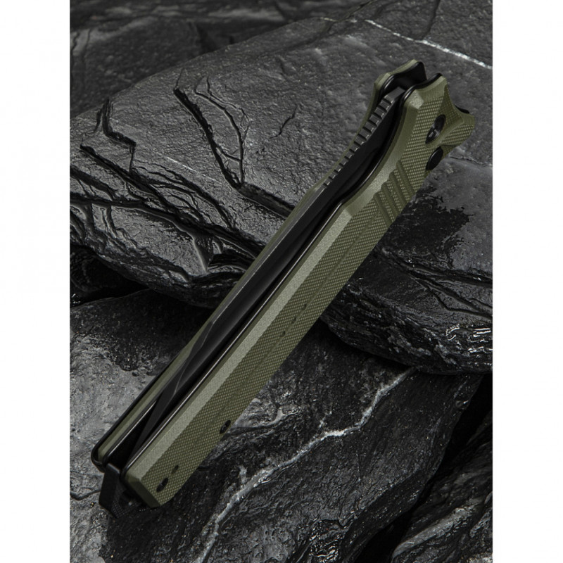 - Нековзне руківʼя G10. Склопластикові накладки з обох боків руківʼя не дають руці ковзати під час утримання інструмента, підвищуючи безпеку експлуатації. Матеріал не вбирає воду та неприємні запахи, несприйнятливий до перепадів температури та зберігає цілісність у разі сильних ударів.