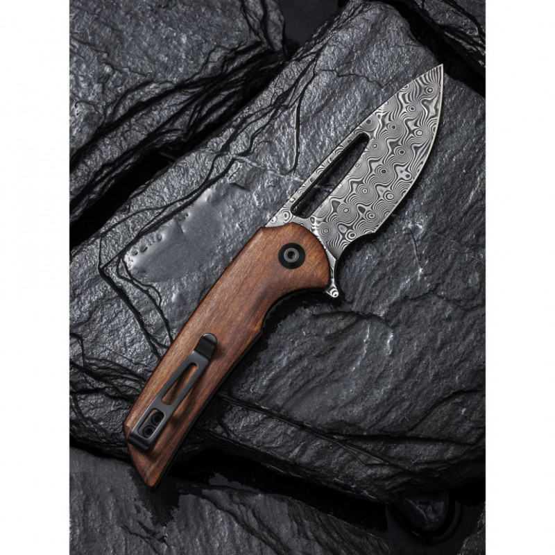 Широкий клинок drop point відкривається за допомогою плавця фліпера або отвору для великого пальця. Лезо має надзвичайно плавний хід, оскільки в осьовому вузлі стоять керамічні кульковальники.