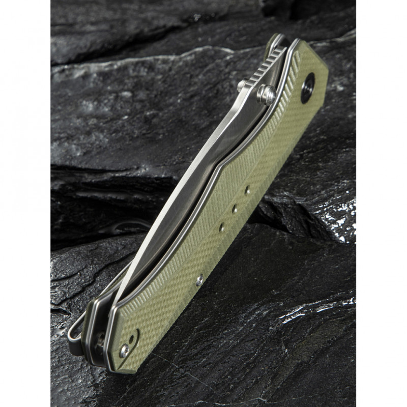 - Сталь Sandvik 14C28N у клинку. Дрібнозерниста шведська сталь містить 14% хрому, що підвищує опір корозії у вологому середовищі. Метал загартований до 58-60 HRC та з успіхом балансує між легкістю в обслуговуванні та тривалістю збереження гостроти. Обробка методом сатинування усуває блиск і приховує дрібні подряпини, які можуть з'явитися на клинку під час різання.