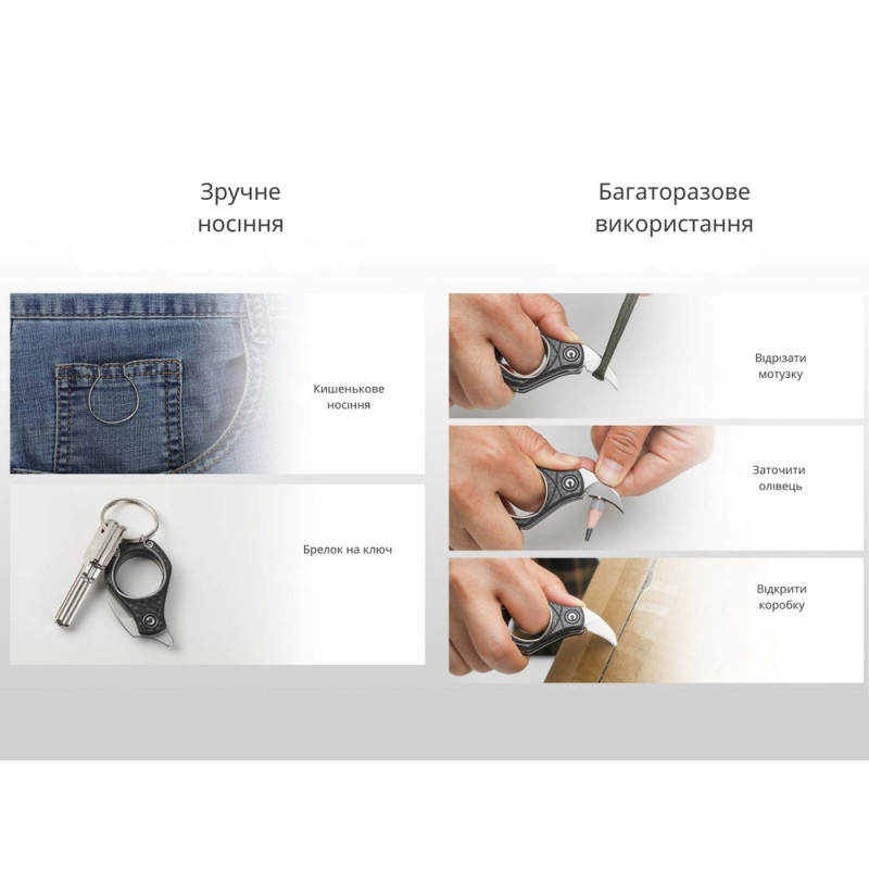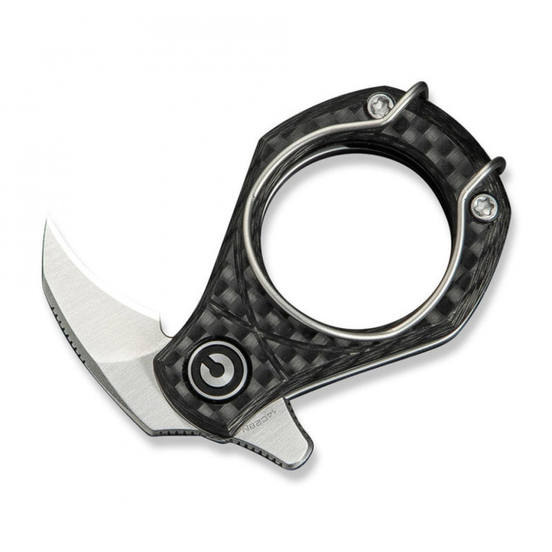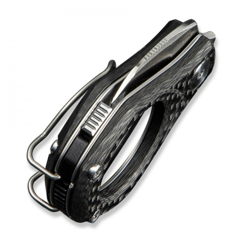 Попри мініатюрні розміри (лише 57,4 мм у закритому положенні), модель не позбавлена ергономіки, за яку відповідають шорсткі накладки з карбону на руківʼї. У конструкції також є кліпса на кишеню, яку можна використовувати як затискач для грошових купюр або кільце для носіння ножа як брелок.