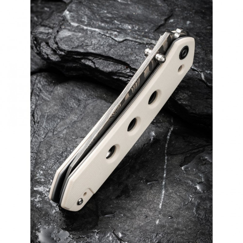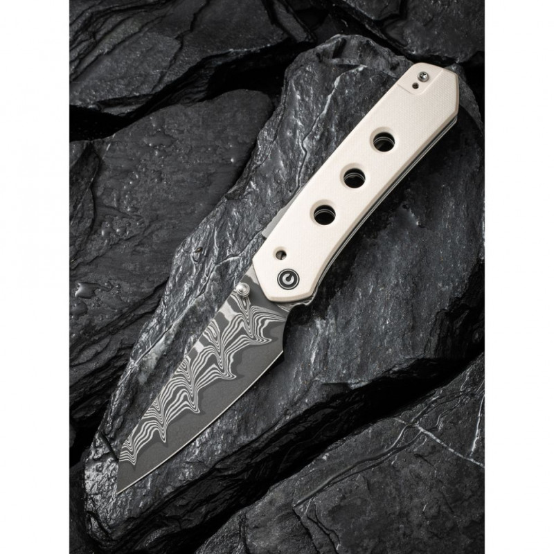 Довжина клинка становить 89.9 мм, а його товщина в обуху дорівнює 3 мм. Клинок виготовлений з висококласної дамаської сталі твердістю близько 58-60 HRC. Метал легко справляється з різанням матеріалів різної щільності — від картону і харчових продуктів до пластику і деревини. Крім того, дамаск демонструє непогану корозійну стійкість і, звичайно, має унікальні візерунки на поверхні, які служать неповторною прикрасою загального дизайну конструкції.