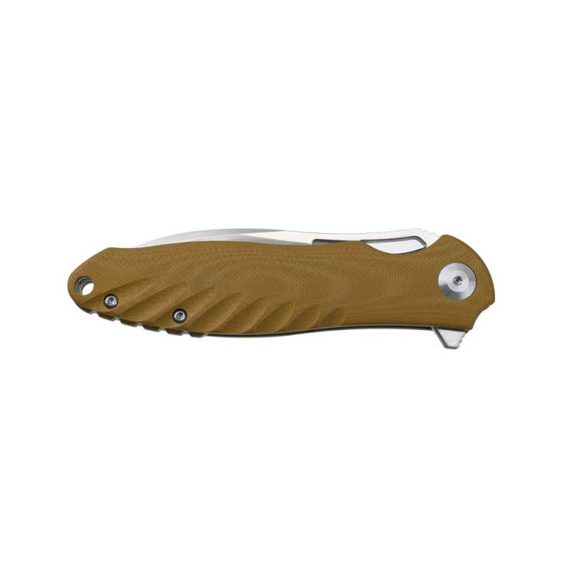 Ручка примірника зроблена з традиційного G10, що додає їй зносостійкість, стійкість до впливу температур і захищеність від механічних ушкоджень. Також цей матеріал, який являє собою склотекстоліт, легко піддається фарбуванню. Він шорсткий на дотик. Виріб комфортно тримати в руці, воно не зміщується, не ковзає. Ніж відносять до категорії фліпперів.
