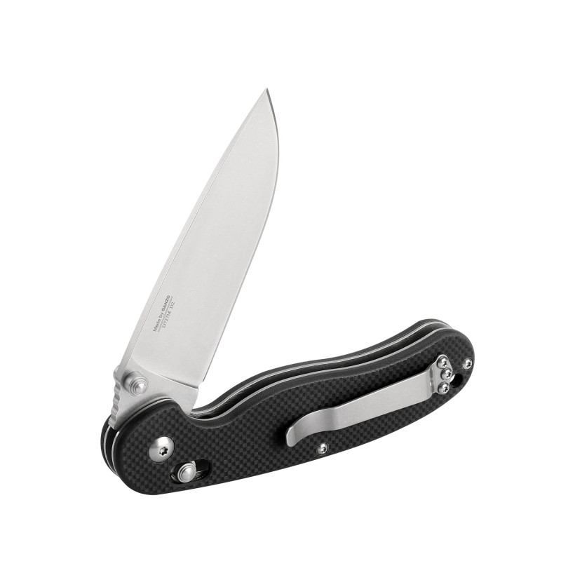Лезо ножа зроблено з нержавіючої сталі, що також великий плюс для ножа, який використовується на природі. У даній моделі використовується марка сталі D2, яка крім високої опірності корозії відрізняється ще й досить великою твердістю (60 одиниць Роквелла). Заточений ніж гладко, що дає можливість різати ним практично будь-які продукти і матеріали. Ganzo 727m довго залишається гострим і легко заточується навіть за допомогою кишенькової точила в польових умовах. Розміри клинка складають 8,9 см при загальних габаритах ножа 21 см. зате в складеному положенні інструмент має розміри всього 12 см. Товщина леза в районі обуха становить 3,5 мм.