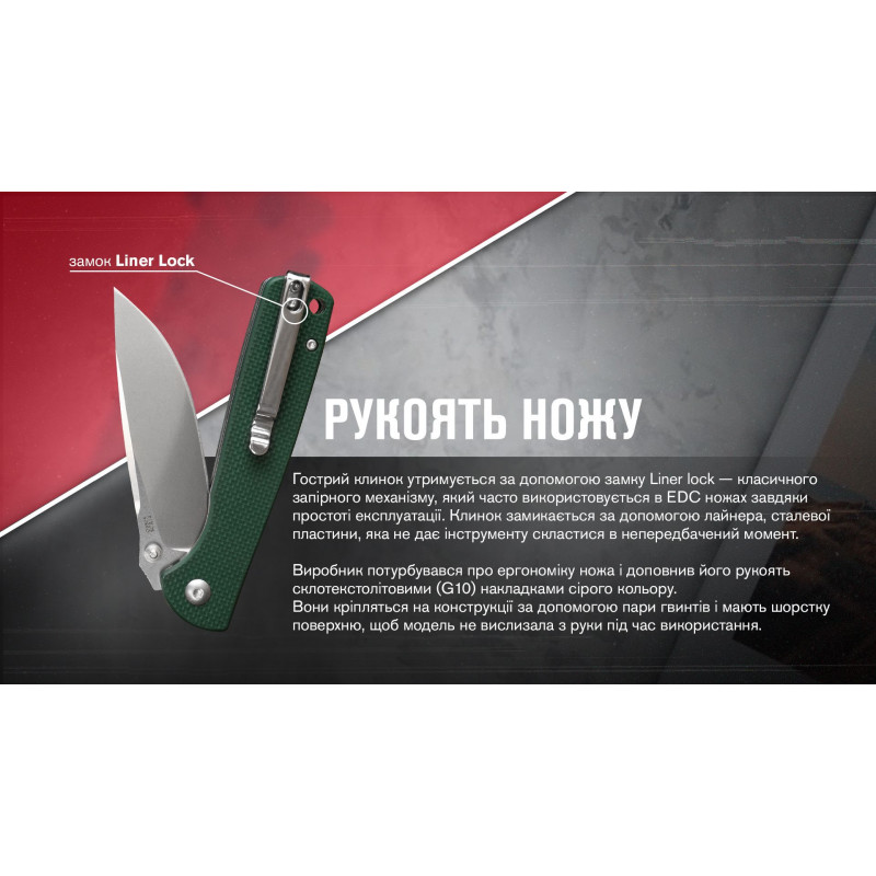 Гострий клинок Ganzo g6805 утримується за допомогою замка Liner lock — класичного запірного механізму, який часто використовується в EDC ножах завдяки простоті експлуатації. Клинок замикається за допомогою лайнера, сталевої пластини, яка не дає інструменту скластися в непередбачений момент.