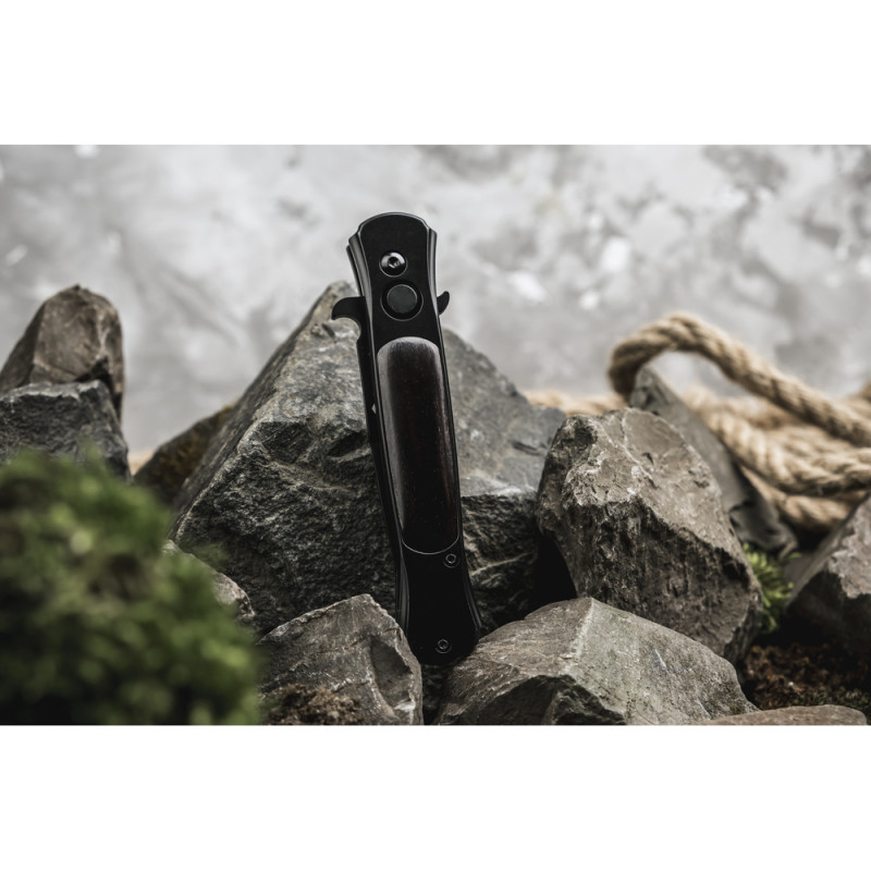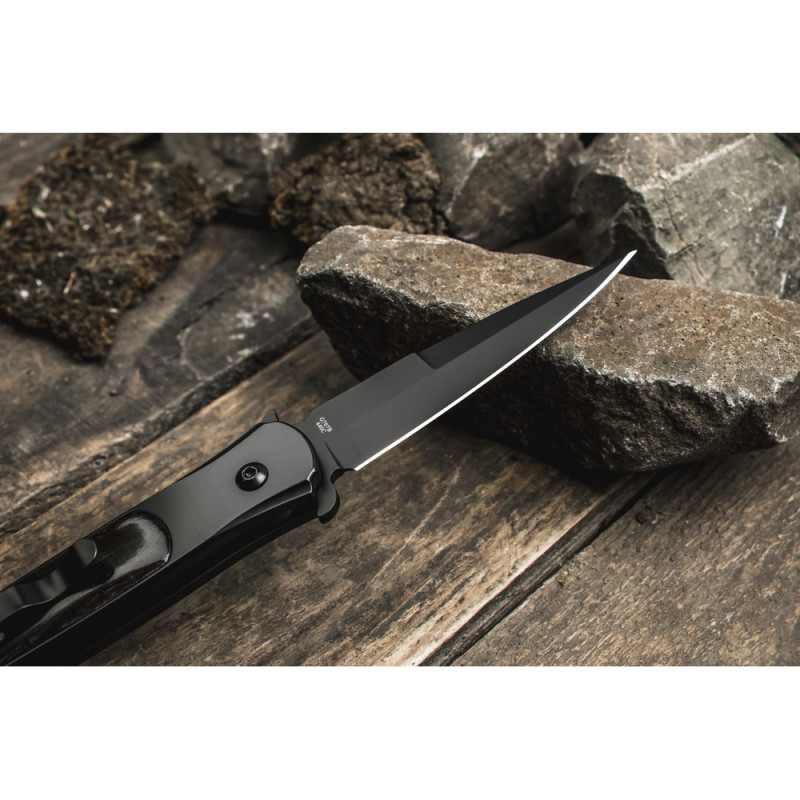 Ще одна особливість моделі — миттєве відкривання леза. Для цього достатньо натиснути кнопку замка auto lock і змахнути запʼястям до фіксації клинка.