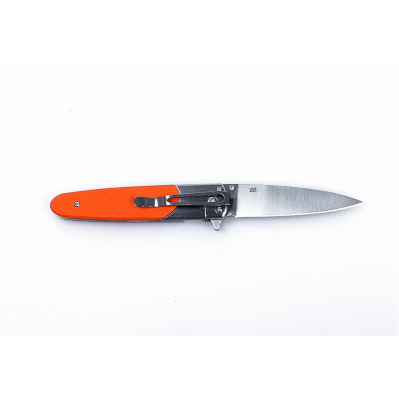 Форма рукоятки в моделі G743-1 дуже лаконічна. Знизу і зверху вона рівна, а зовнішній торець акуратно закруглений. Ближче до клинку частина рукоятки зроблена із сталі і відшліфована тим же методом, що і клинок. До цієї металевої частини кріпиться і кліпса, що служить додатковою мірою фіксації ножа, коли він повинен залишатися в зоні доступності під час поїздок власника ножа на природу.
