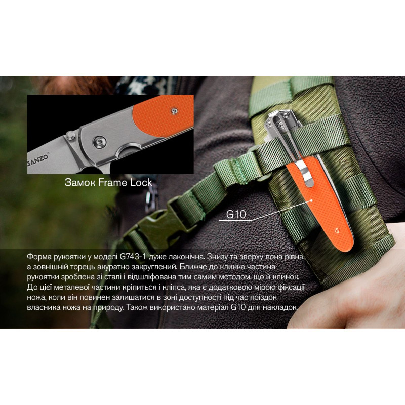 Ніж для туризму Ganzo G743-1 — це практична модель, яка поміститься до будь-якого вашого спорядження. Клинок довжиною 87 мм легко складається всередину рукоятки, завдяки чому переносити ніж стає повністю безпечно. Щоб відкрити його і приступити до роботи, достатньо легко потягнути за шпеник. До речі, у відкритому вигляді лезо легко фіксується і вже не рухається навіть під навантаженням. Цьому сприяє замок Frame Lock — різновид лінійного механізму зі сталевою притискною пружиною, яка одночасно є елементом рукоятки.
