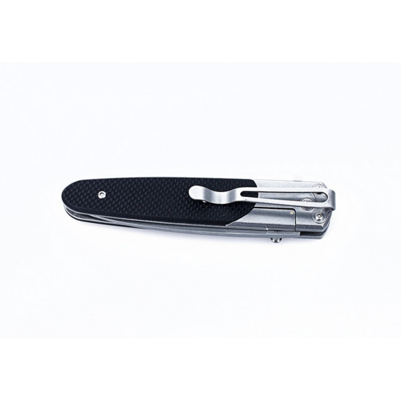 Форма рукоятки в моделі G743-2 дуже лаконічна. Знизу і зверху вона рівна, а зовнішній торець акуратно закруглений. Ближче до клинку частина рукоятки зроблена із сталі і відшліфована тим же методом, що і клинок. До цієї металевої частини кріпиться і кліпса, що служить додатковою мірою фіксації ножа, коли він повинен залишатися в зоні доступності під час поїздок власника ножа на природу.