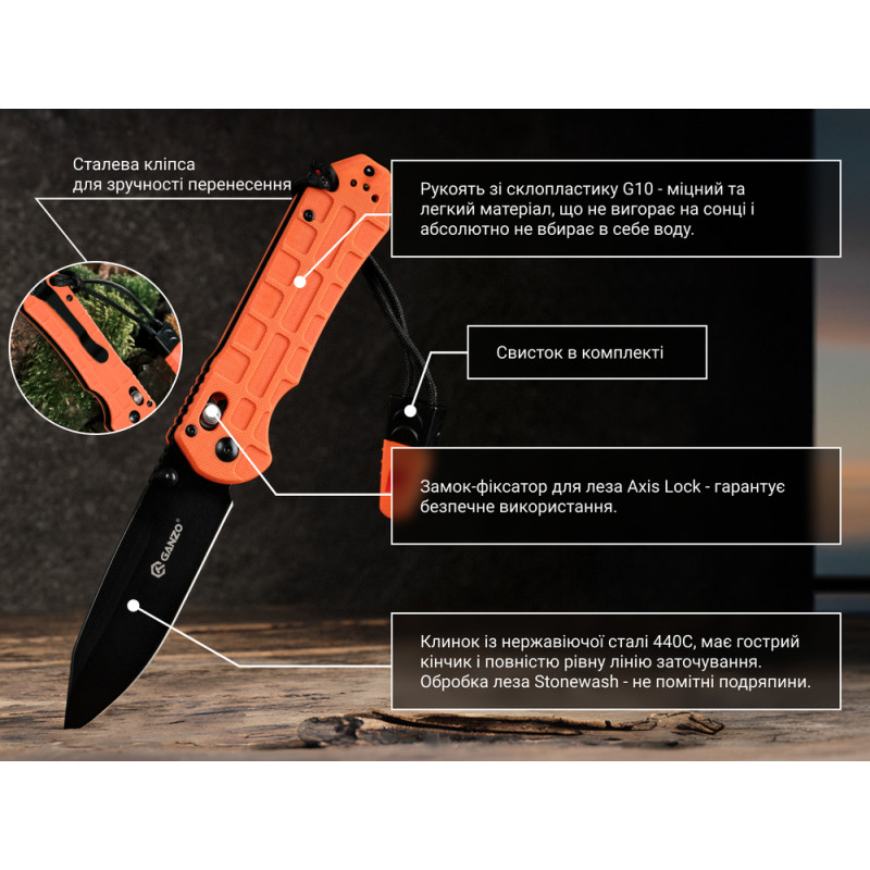 Приємне доповнення моделі Ganzo G7453P — це свисток, прикріплений до рукоятці за допомогою невеликого шнурка.