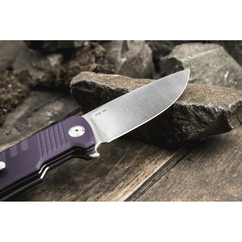 - Лезо виготовлене зі сталі D2, відомої завдяки зносостійкості, простотою в заточуванні та опірності до корозії. Скільки твердість сягає ±60 HRC, різальна кромка зберігає гостроту впродовж тривалого часу, забезпечуючи точне різання.