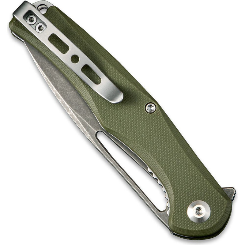 Ручка виконана з G10, має зручну форму, важлива особливість - шорстка текстура, завдяки чому ніж гарно тримати в руках. Ручка додатково має кліпсу глибокої посадки.