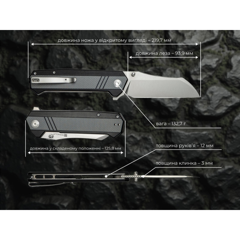 - Накладки G10 на руківʼї. Склопластик з шорсткою поверхнею не дає долоні ковзати по конструкції, підвищуючи безпеку експлуатації. До того ж G10 не боїться механічного впливу, не вбирає вологу та зберігає форму у разі перепадів температури.