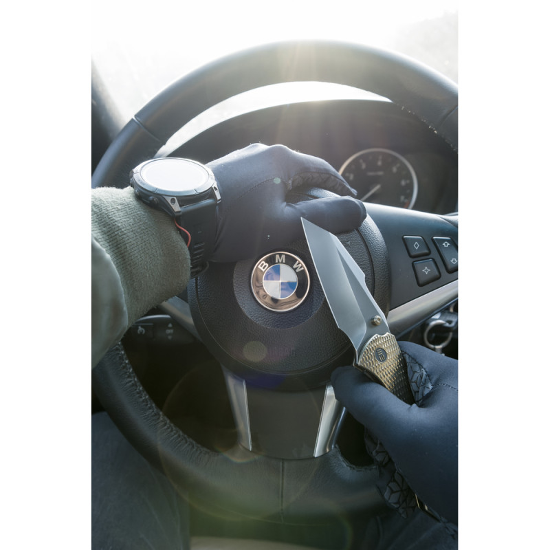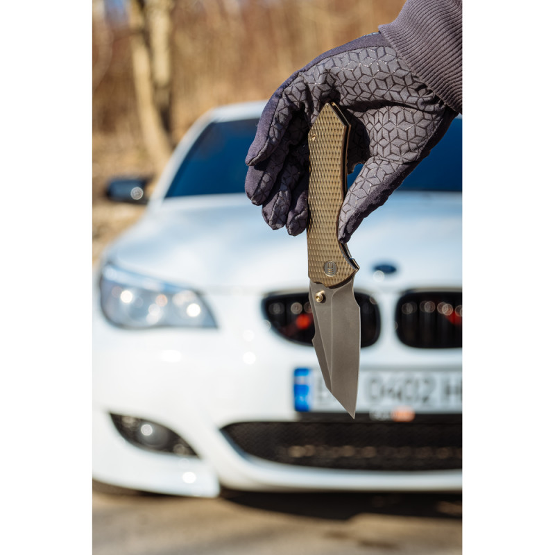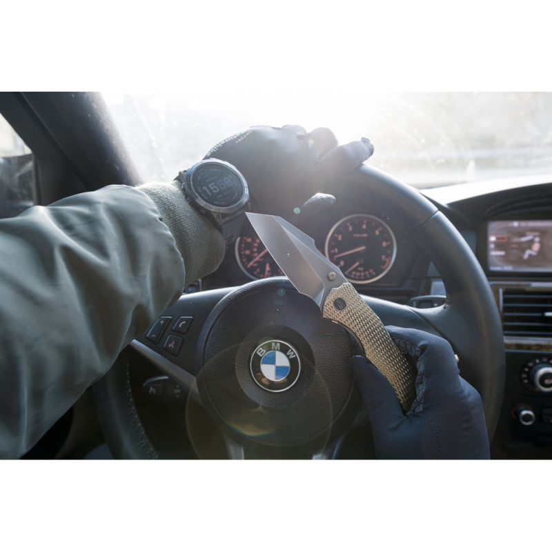 Загострений хвіст руківʼя слугує не тільки оригінальною деталлю дизайну — ви можете використовувати його як склобій в екстреній ситуації. З правого боку конструкції закріплена однопозиційна кліпса Deep Carry, яка дозволяє носити ніж у кишені в положенні Tip-Up (вістрям вгору). Кліпса виконана з титану, як й інші дрібні елементи.