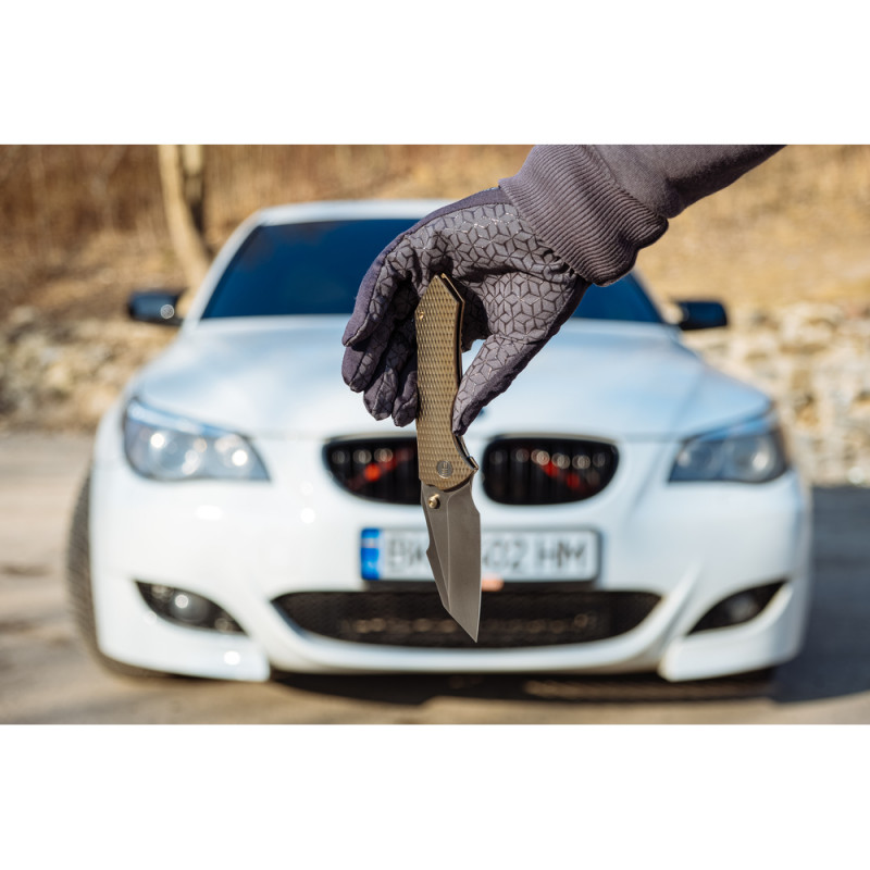 Для відкривання ножа слід натиснути на титановий шпеник, розташований по обидва боки клинка. Лезо доводиться до робочого положення з мінімальними зусиллями завдяки керамічним підшипникам в осьовому вузлі, які покращують плавність ходу. За безпеку відповідає замок Frame Lock зі сталевою вставкою для запобігання протиранню лицьової поверхні механізму.