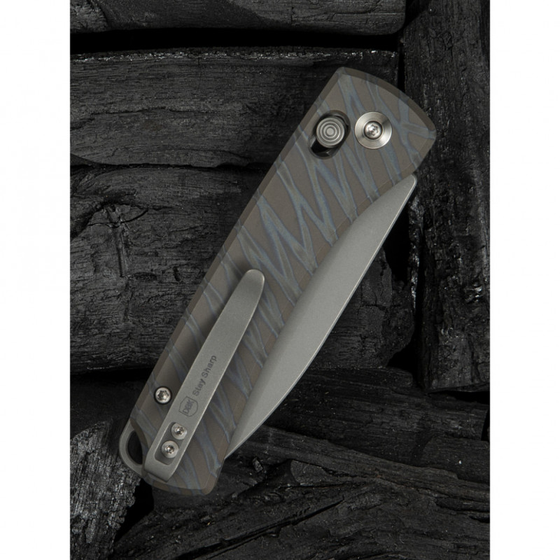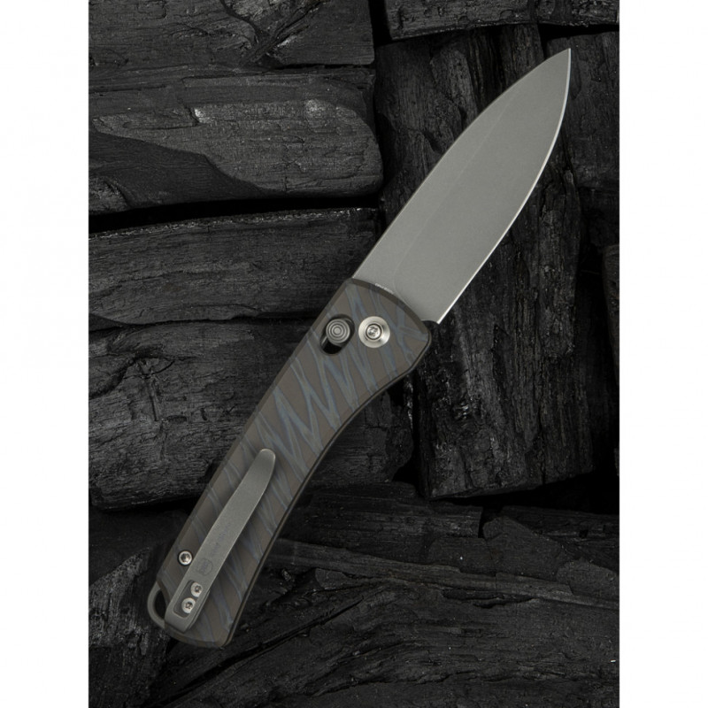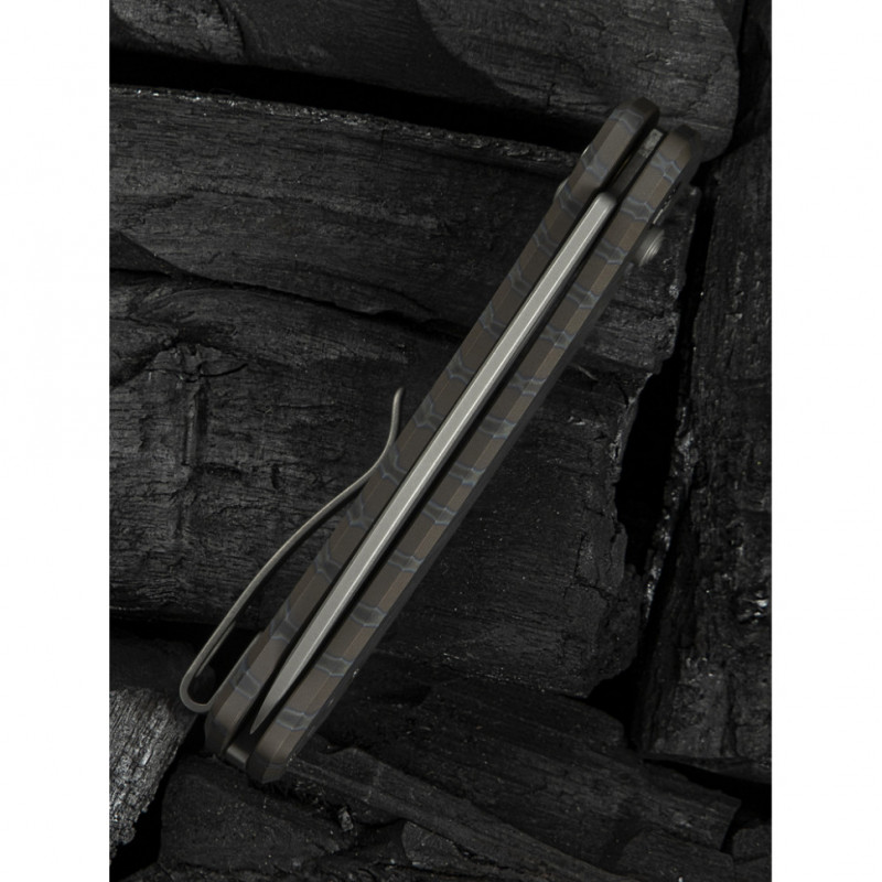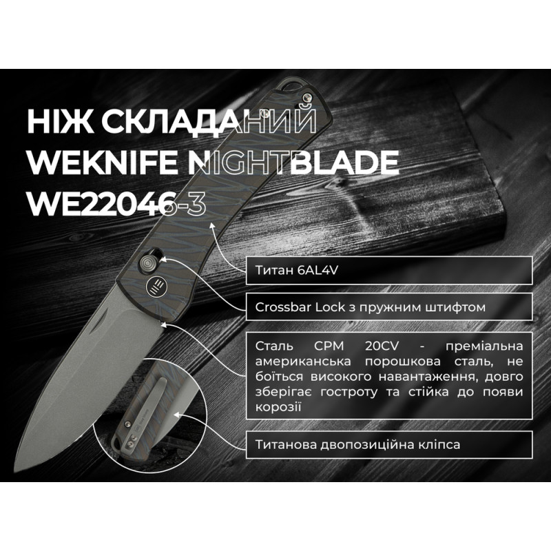 Weknife Nightblade легко відкривається та закривається завдяки кульковим керамічним підшипникам в осьовому вузлі. Титанова кліпса полегшує носіння на кишені, щільно фіксуючи інструмент без ризику його втрати. У хвості є наскрізний отвір для страхувального темляка або декоративного паракорда.