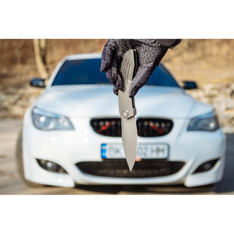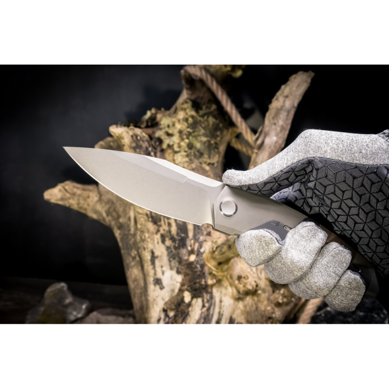 - Руківʼя з титану 6AL4V. Сплав широко застосовується не тільки в ножовій, а й в аерокосмічній та медичній промисловості. У складі є 6% алюмінію та 4% ванадію, які наділяють метал стійкістю до зношування та антикорозійними властивостями. Водночас метал залишається легким, знижуючи вагу інструмента, а сатинова поверхня з ручним поліруванням привносить ще більше естетики в загальний дизайн.