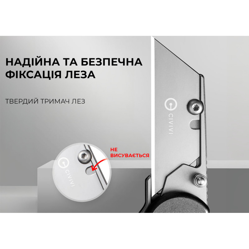 Ніж оснащений канцелярським ножем замість класичного клинка, тому стане в пригоді не тільки для вирішення повсякденних завдань, а й для професійної діяльності. Тонке лезо акуратно й точно ріже картон, мотузки, вироби зі шкіри, пластику та гуми. У наборі є 3 змінні клинки ідентичної форми. Всі вони виготовлені з нержавіючої сталі 6Cr, обробленої методом галтування для усунення блиску металу.