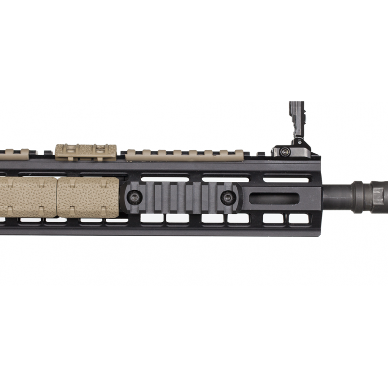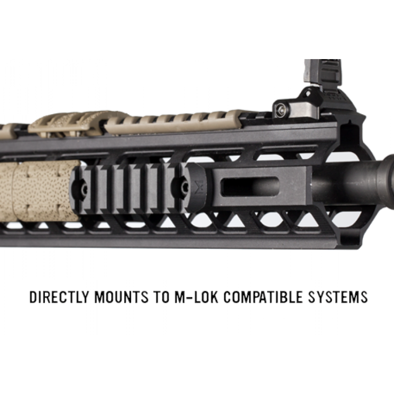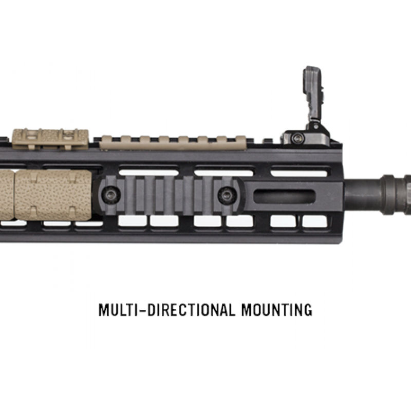 Обтічна форма і відсутність гострих кутів перешкоджають зачепам планки за спорядження або одяг. Планка комплектується кріпленнями для установки на цівки системи M-LOK.