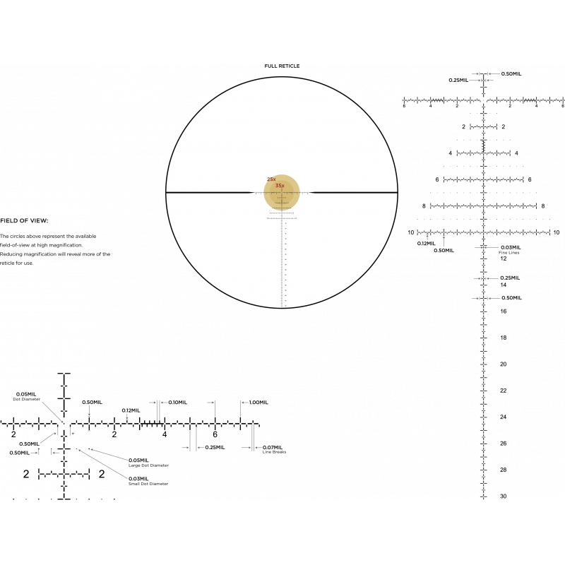 Центральна трубка має нестандартний діаметр 35мм, максимальний діапазон поправки по вертикалі 35 MIL/120 MOA, по горизонталі - 17 MIL/60 MOA і при цьому не псує якість зображення.
