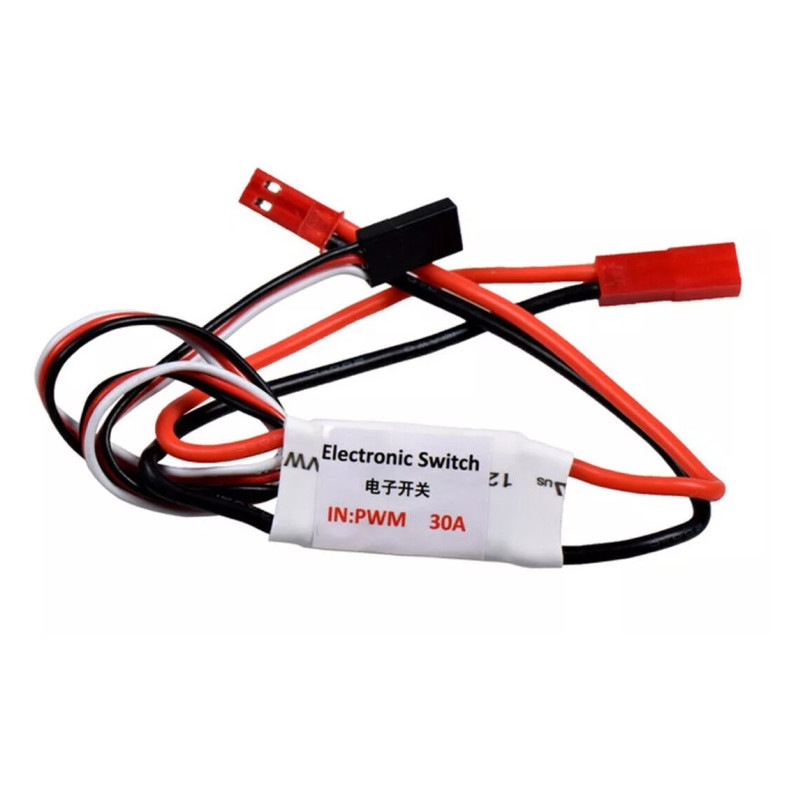 RCES-30A – це напівпровідниковий вимикач, який керується сигналом з приймача та підтримує навантаження до 30А в діапазоні 3.7-27В. Підключивши його до каналу приймача, можна дистанційно вмикати та вимикати додаткове обладнання, таке як фари, бортові вогні, звукові ефекти, димогенератори та електростартери. Вимикач спрацьовує при переході сигналу через 50% (~1500uS). Він оснащений проводами 18AWG з конекторами JST і важить всього 11 г. Ідеальний для використання з 1-6S LiPo акумуляторами.
