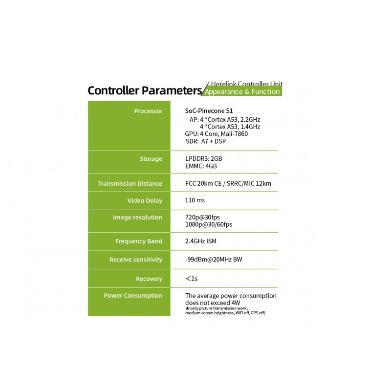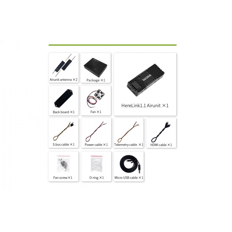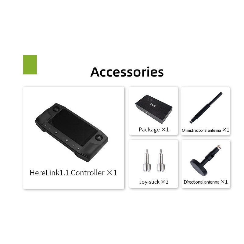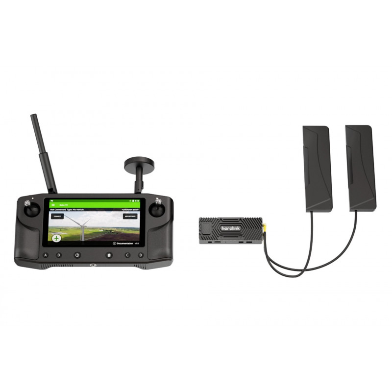 Herelink HD складається з пульта дистанційного керування і модуля бортового модуля. Пульт ДУ 2,4 ГГц з вбудованим екраном дозволяє пілоту і операторам отримувати HD-відео, телеметрію і управляти безпілотником на відстані до 20 км в FCC і 12 км в CE. Затримка відеопотоку складає менш ніж 110 мс.