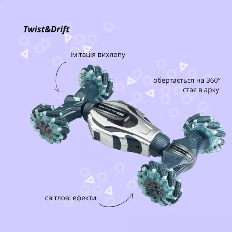 Twist&Drift працює на частоті 2,4G і оснащена повним приводом 4x4, що дозволяє їй долати навіть найскладніші перешкоди. Її максимальна швидкість сягає 15 км/год, а керувати нею можна на відстані до 40 метрів! Вона здатна працювати до 30 хвилин без перерви – і це більше, ніж достатньо для справжніх пригод!