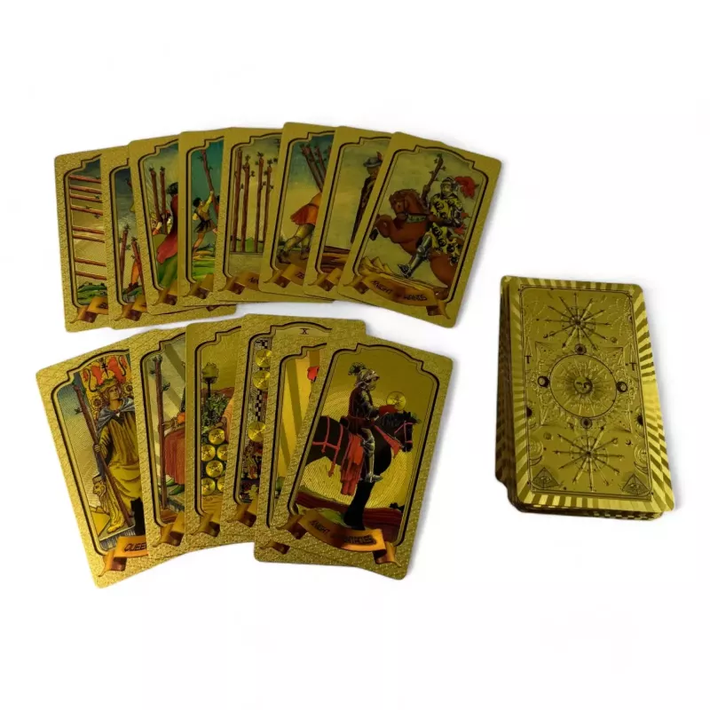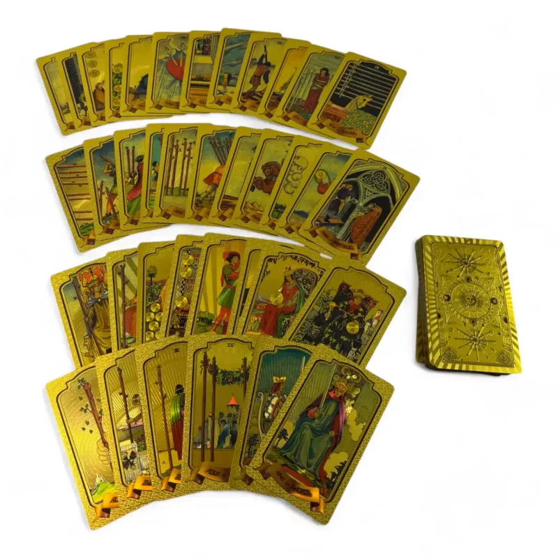Карти Таро в класичному стилі Райдера Уейта. Це одна з найпопулярніших колод Таро, що складається з 78 карт (22 карти Старших Арканів та 56 карт Молодших Арканів). Карти виконані з пластику із золотистим покриттям, що надає їм більш розкішного та довговічного вигляду.