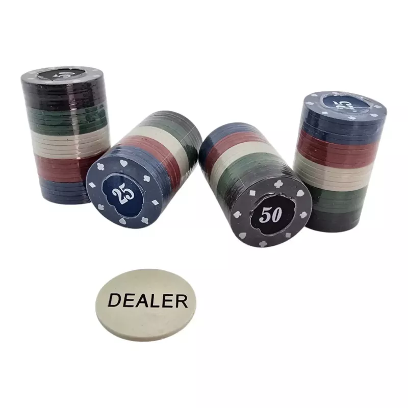 Набір для домашніх ігор покеру. У комплекті 100 фішок п'яти номіналів по 20 штук кожного та фішка дилера. Міцні пластикові фішки зручно перемішувати та збирати у купки. Підходить для Техаського Холдему, Омахи та інших карткових ігор.