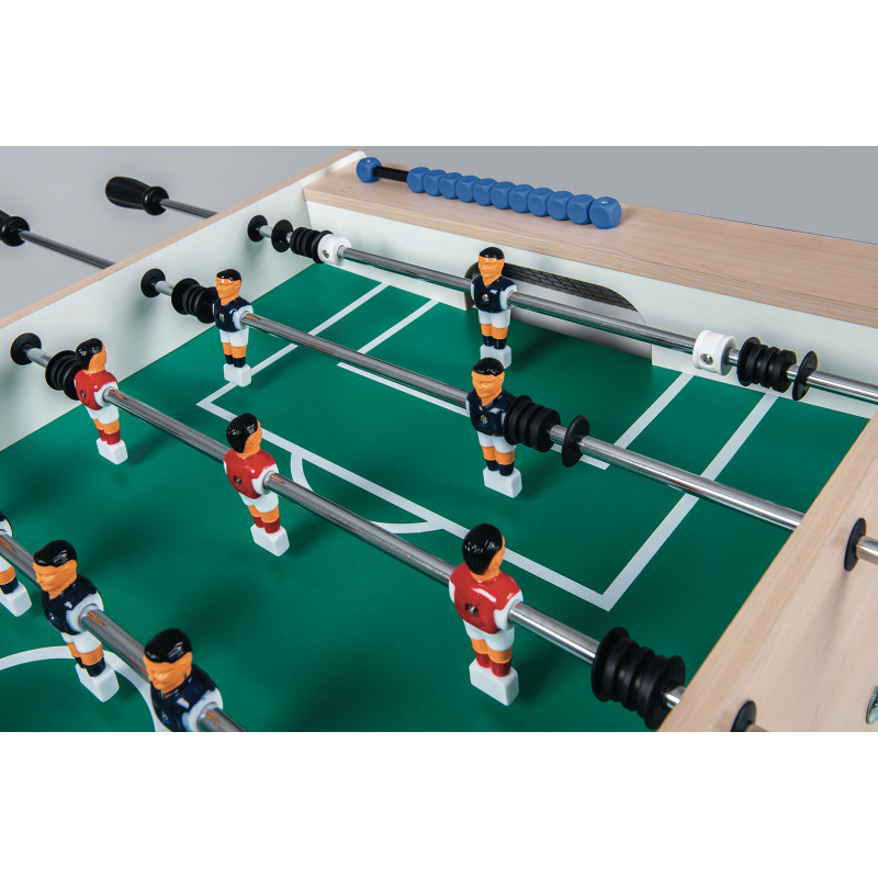 - Ігрове поле із ламіната на основі ДСП зі скошеними кутами. Білі лінії на зеленому тлі нанесені методом шовкографії, відтворюючи футбольне поле.