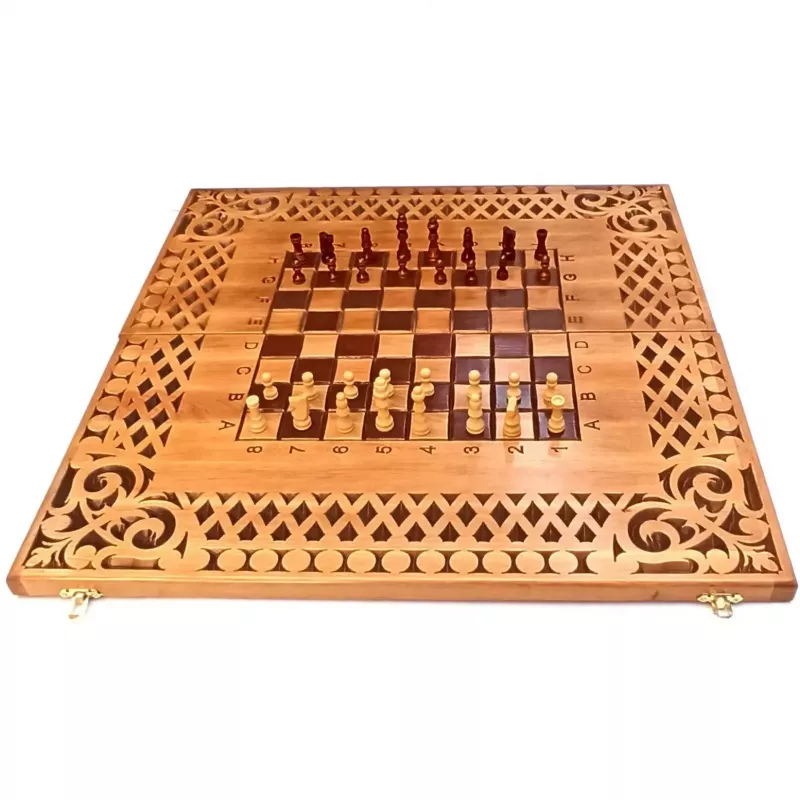 Набір 3 в 1 нарди-шахи-шашки дерев'яні різьблені 56×28×5 см фігури, фішки дерево, клітина 3,1*3,1 см (DN34146)