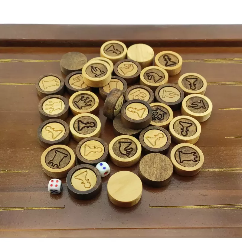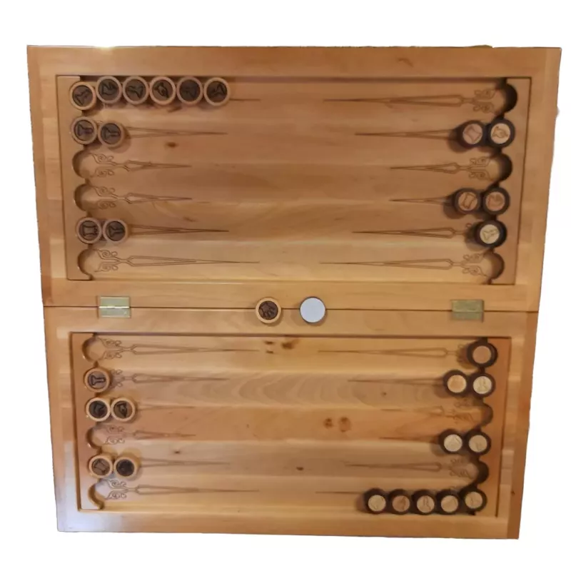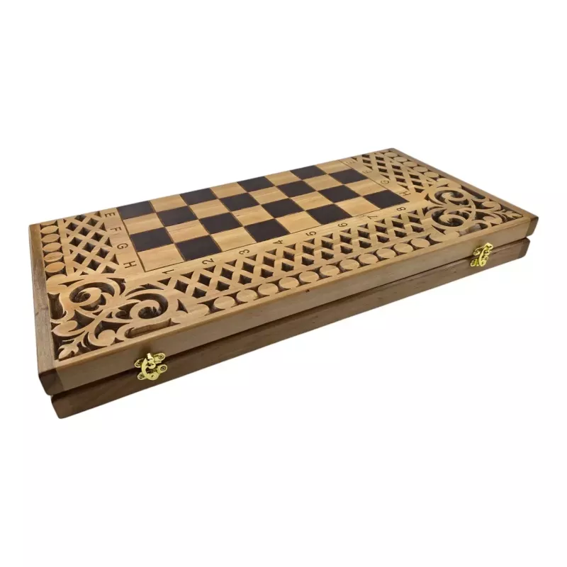 Нарди-шахи-шашки – це універсальна настільна гра, яка складається з двох ігрових полів: нарди, шахи. В шашки можна грати на стороні шахової дошки. Цей комплект виконаний з цільного масиву дерева та має різьблені деталі. Розміри ігрового поля складають 56х 56 см, а розмір в складеному вигляді 56х28х4,5 см. Особливостю цього набору є те, що фішки універсальні для усіх трьох ігор, бо на кожній фішці намальована шахова фігура. Фішки виготовлені з масиву дерева. Дерев'яні класичні фігури можна придбати окремо.