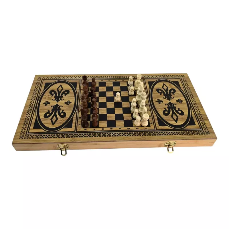 Універсальний набір для поціновувачів інтелектуальних ігор, для сімейного дозвілля чи вишуканого подарунка. Складана дошка з бамбука служить одразу для трьох ігор - шахів, шашок та нард. Усередині зручно зберігаються дерев'яні фігури та фішки, а надійні застібки утримують кейс при перенесенні. Нарди з осередками для фішок. Розмір у складеному стані дозволяє брати набір у дорогу, а розкладена дошка 48х48 см забезпечує комфортну гру як дорослим, так і дітям.