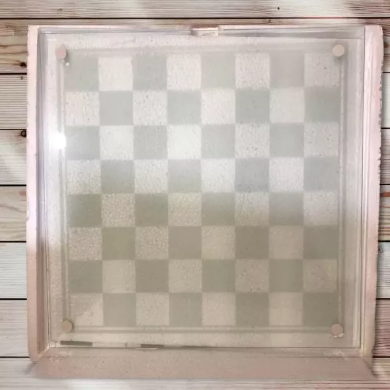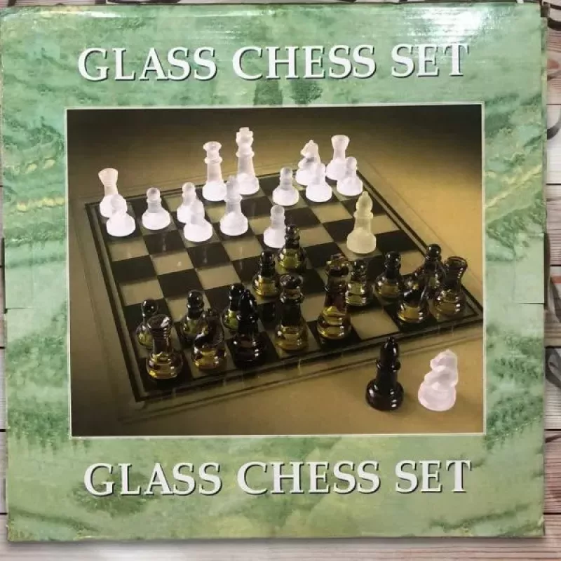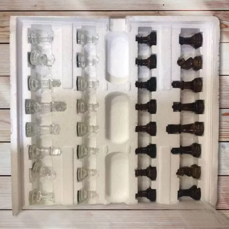 Набір шахів складається зі скляної матової дошки та скляних фігур коричневого та білого кольору, дошка розміром 35x35 см, ігрове поле 30х30 см, клітинка 4х4 см. Висота пішака 4,2 см, діаметр 2,8 см, висота короля 7,6 см діаметр 3см. Набір упаковані в картонній подарунковій коробці.