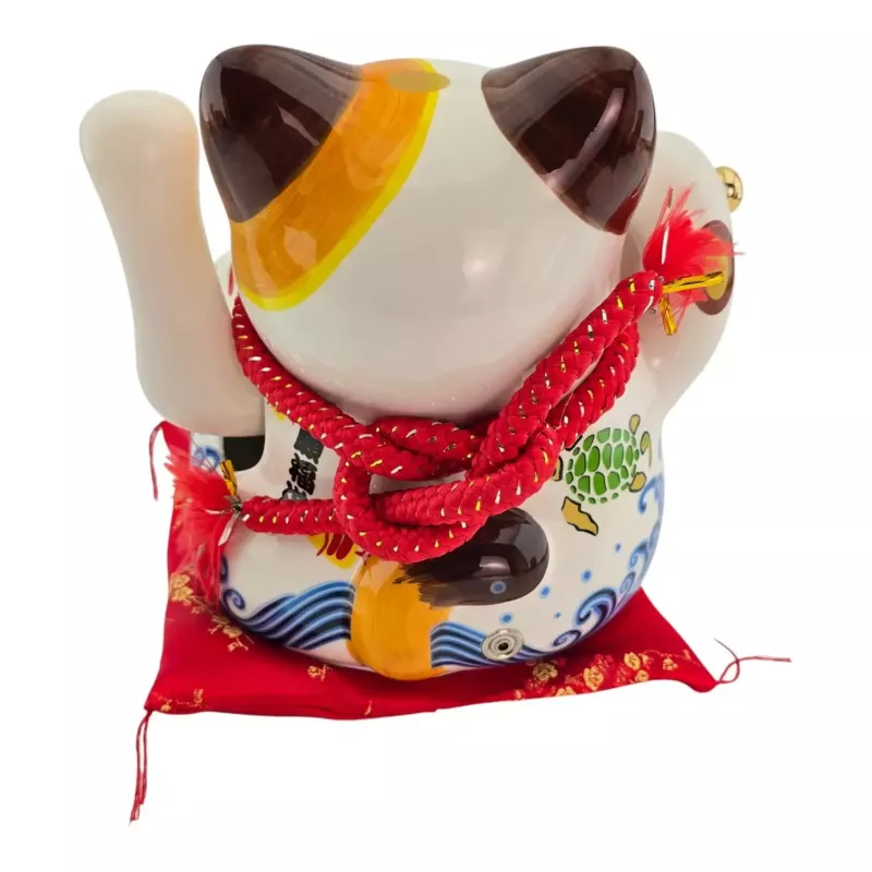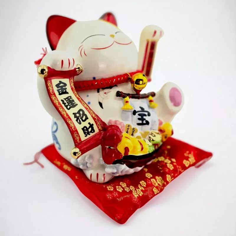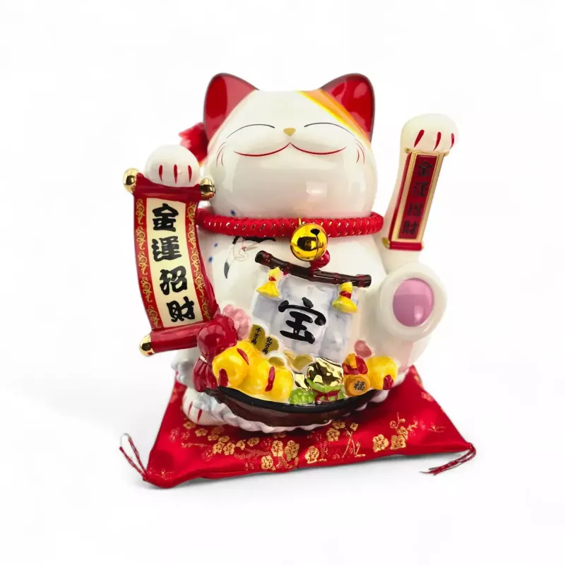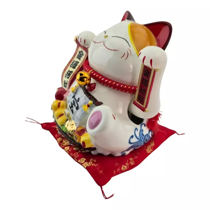 Класичний кіт Манекі-Неко для залучення удачі та достатку. Може працювати від електромережі або батарейок, тому зручно ставити у примішщенні. У комплекті декоративна червона подушечка та шнур живлення 85 см.