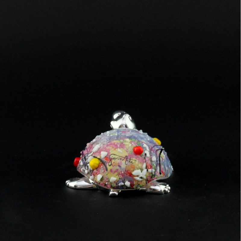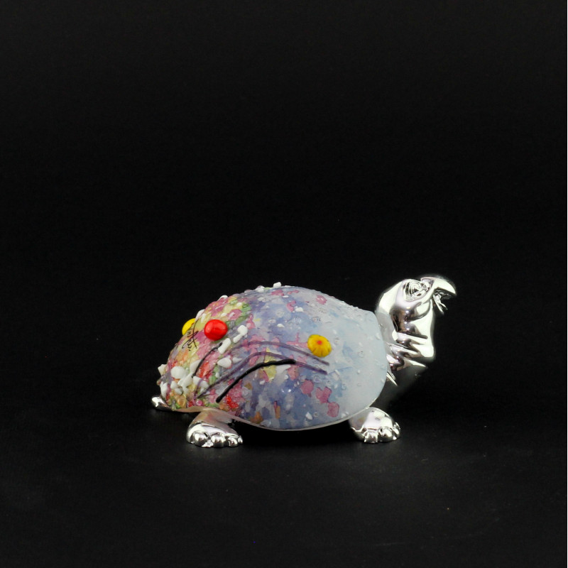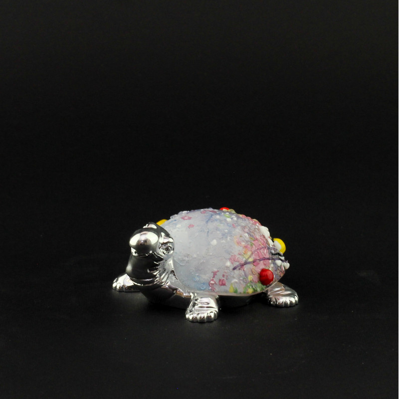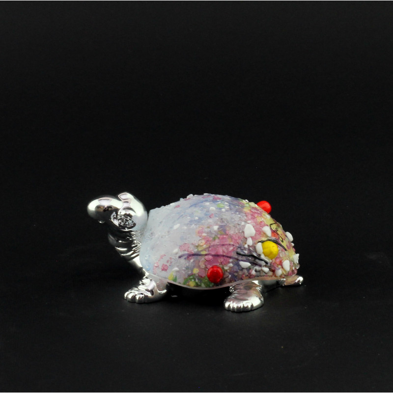 Зроблена з гальванопластика, відразу приваблює своєю витонченою кольоровою гамою. Спинка тварини, немов райдужний розпис, стильно поєднується із сріблястого кольору тулубом. Черепаха з фен-шуй є оберегом, символом захисту та єднання. Розташована навпроти входу в будинок фігурка цього земноводного створює надійний тил для мешканців будинку, посилює взаєморозуміння поколінь.