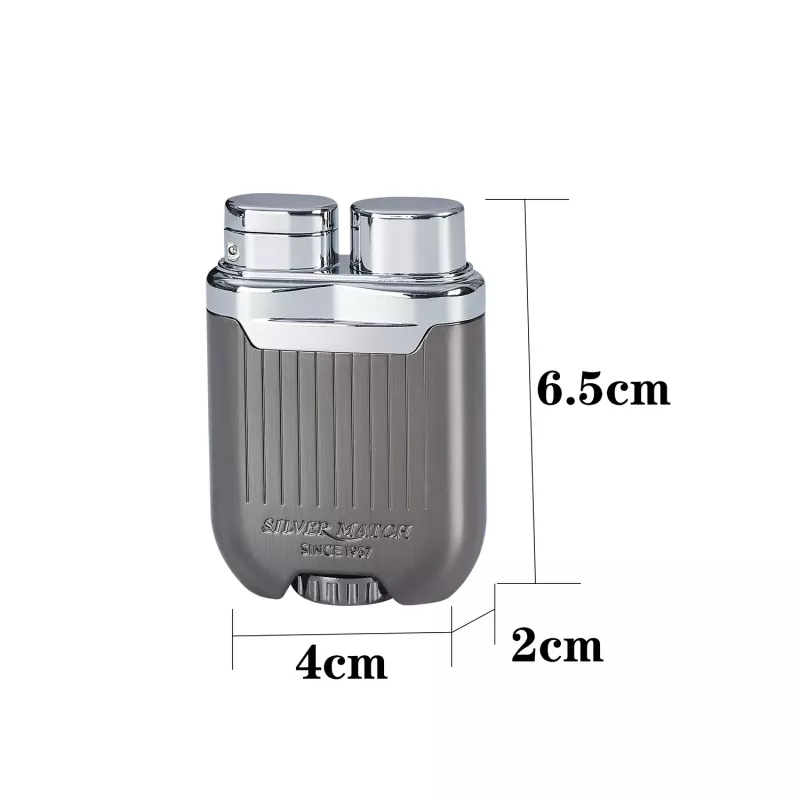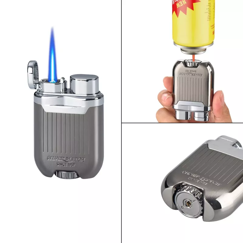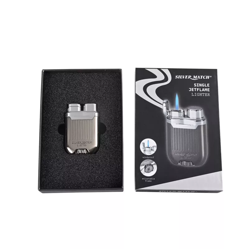 | Silver Match | Металева газова запальничка з турбонадувом у вінтажному стилі. Запальничка приємної обтічної форми, невелика, важка, зручно лежить у руці. Поверхня гладка, з невеликими поздовжніми смугами практично не залишає відбитків пальців. Запальничка дуже цікавої конструкції. При натисканні на клавішу праворуч, ліворуч відскакує кришка і з'являється потужне полум'я турбо. Внизу зручне коліщатко для регулювання подачі палива, а також клапан для заправки запальнички. |