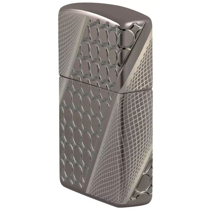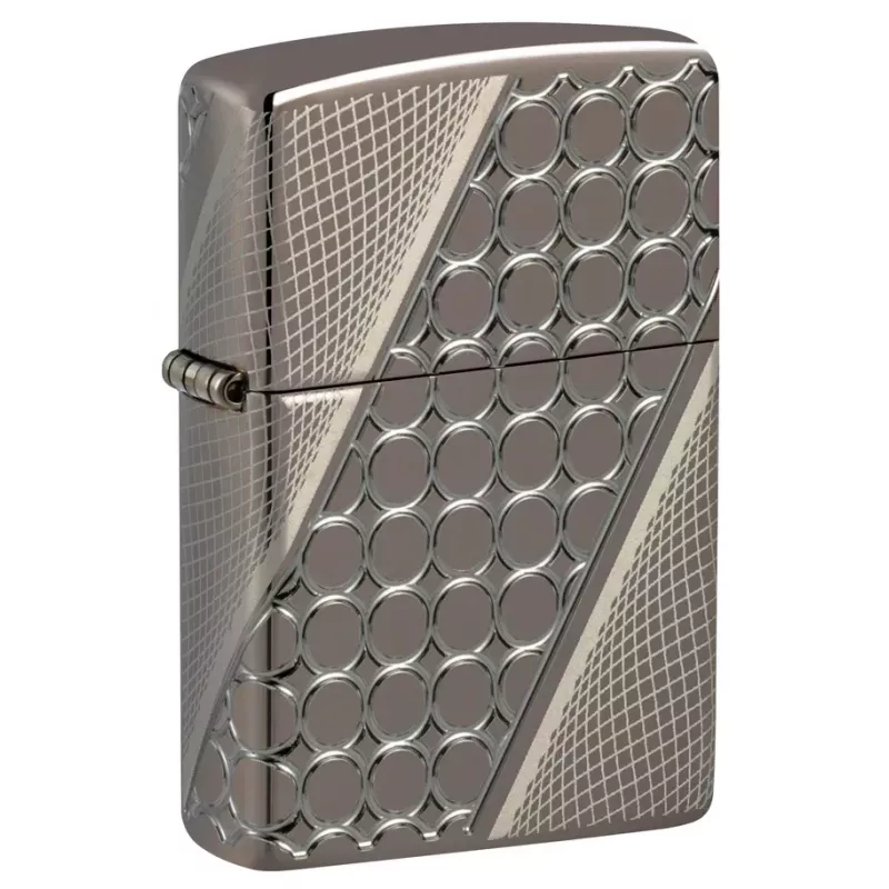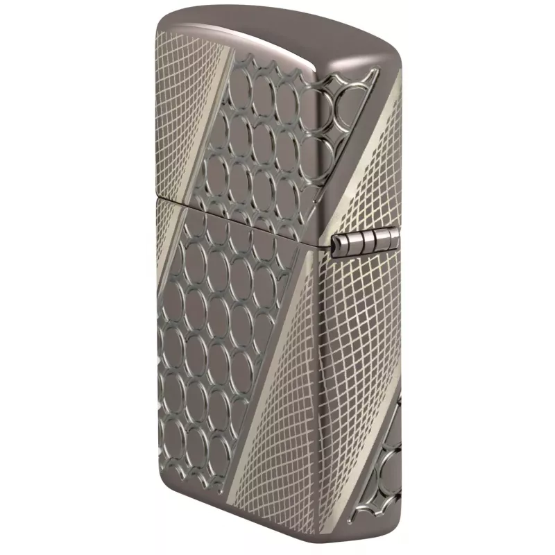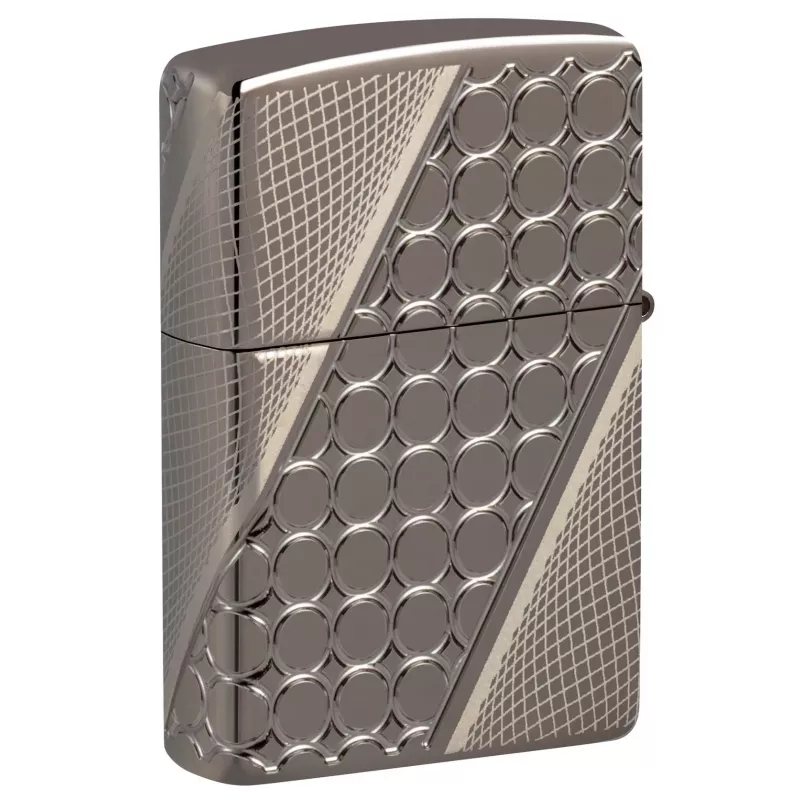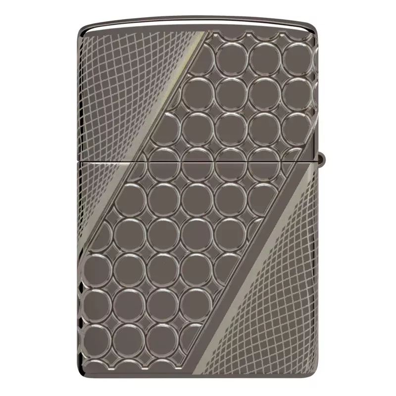 Яскрава смуга з точок MultiCut проходить по передній і задній сторонах цієї запальнички Armor Black Ice ® , оточена плавним візерунком, створеним за допомогою нашої технології Photo Image 360 °. Повністю металева конструкція приблизно в 1,5 рази товщі стандартного корпусу Zippo