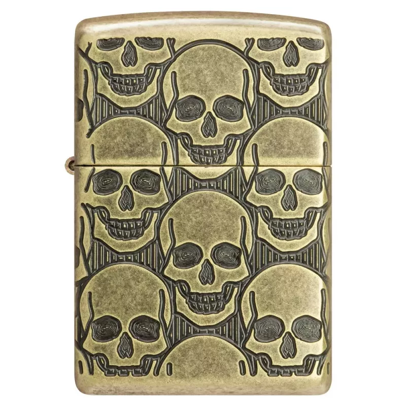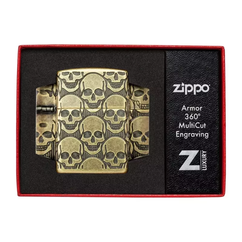 Корпус запальнички Zippo 46302 Armor Skulls Design має покриття у стилі античної латуні. Особливість даної моделі це потовщена стінка корпусу запальнички, приблизно в півтора рази, що додає їй вагу і міцність. Завдяки технології глибокого гравіювання Zippo 360° MultiCut, по всьому корпусу розташувався цілий натовп черепів, що посміхаються.