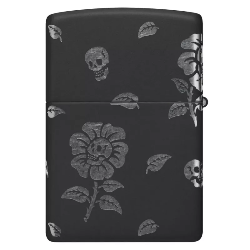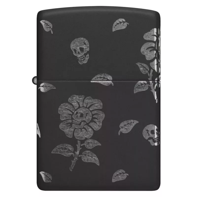 Усміхнені черепи утворюють центри розквітлих квітів, що ніжно танцюють навколо всіх боків цієї класичної чорної матової запальнички. Завдяки лазерній обробці 360° під гладкою поверхнею корпусу запальнички ховаються хромовані відтінки. Поставляється в подарунковій коробці. Для оптимальної роботи заправте запальничку паливом Zippo.