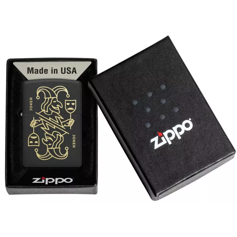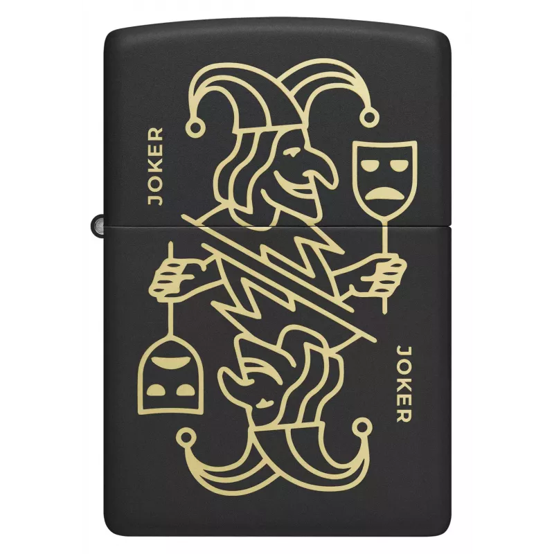 Корпус запальнички Zippo 46290 Joker Card Design має чорне матове покриття. Нанесення фарби проводиться методом спікання при високій температурі, завдяки чому вона не схильна до вицвітання і стирання. На лицьовій стороні, методом лазерного гравіювання, виконано малюнок карти Джокера. Вишуканий дизайн карти "Джокер" мерехтить латунними відтінками на поверхні цієї класичної чорної матової запальнички з химерним лазерним гравіюванням. Поставляється у подарунковій коробці. Для оптимальної роботи заправте запальничку бензином Zippo.