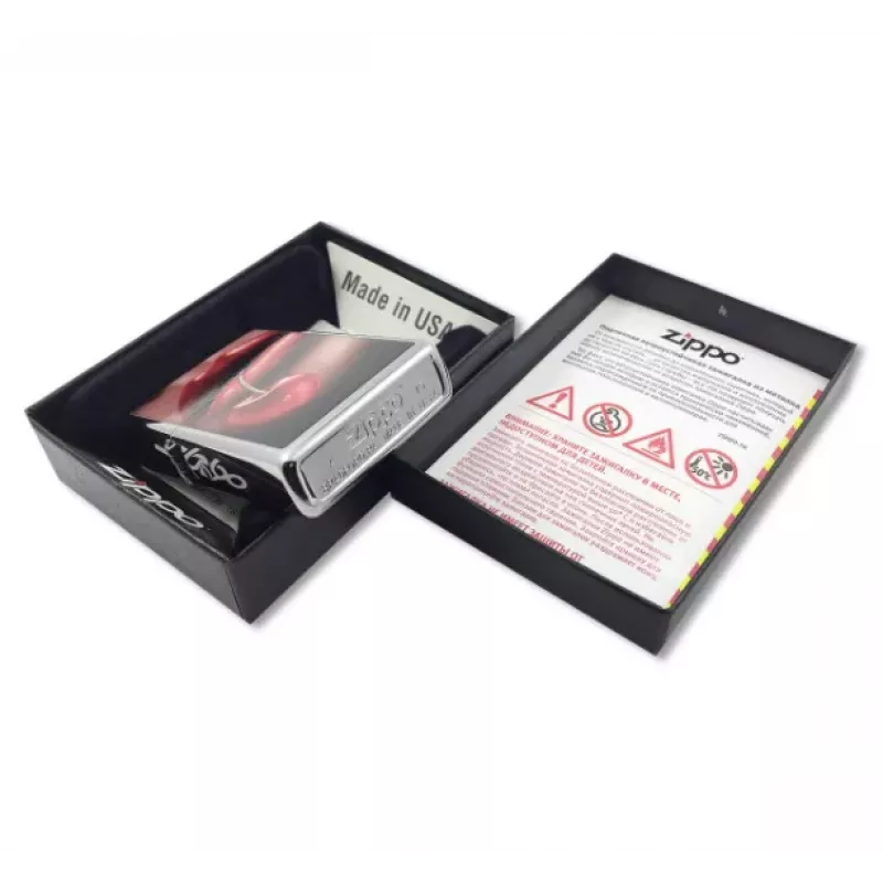 Класична бензинова запальничка Zippo 28655 Lips & Cherries High Polish Chrome. Металевий корпус має глянсове хромоване покриття. На лицьовій стороні спокусливе зображення чуттєвих жіночих губ з вишнею. Запальничка Zippo упакована у подарункову коробочку з логотипом Zippo.