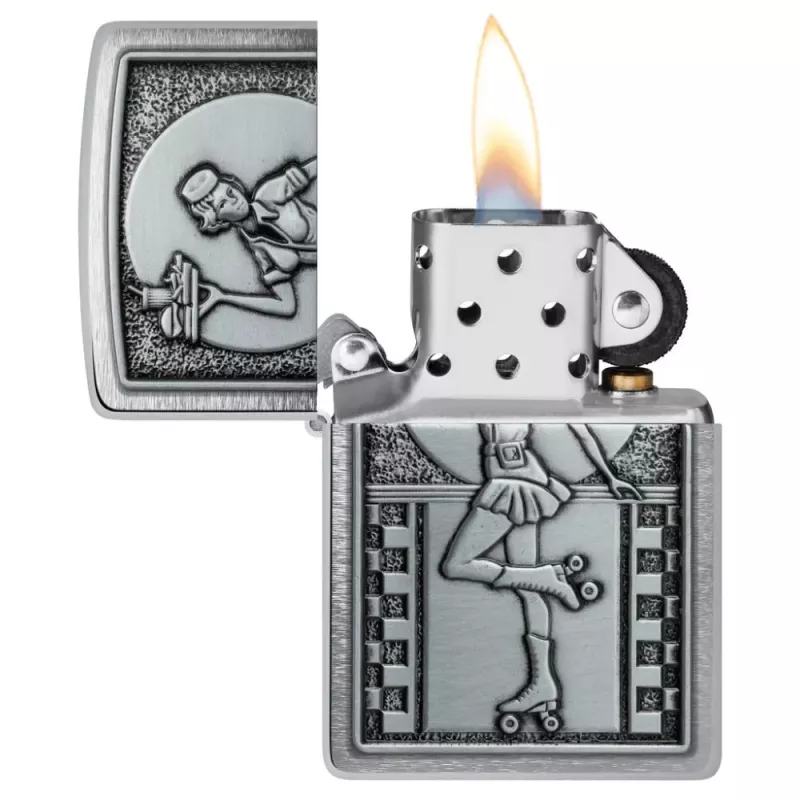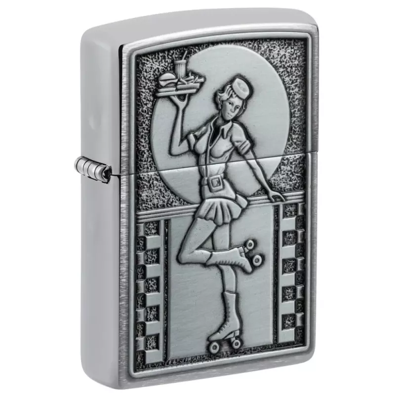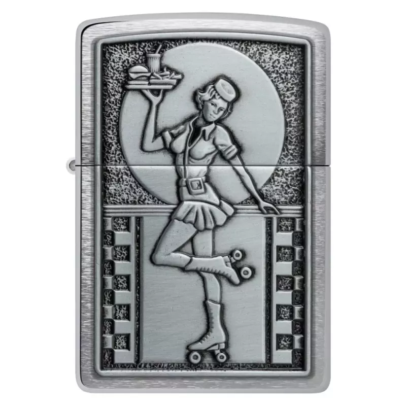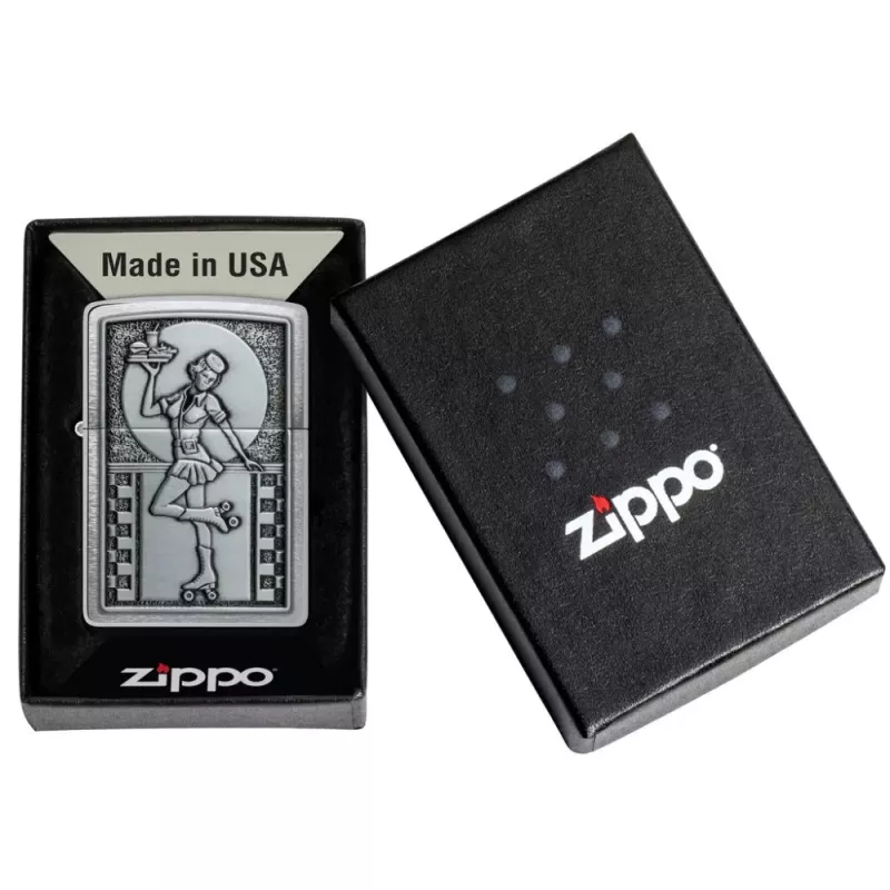 Корпус запальнички Zippo 48904 Roller Waitress має матове покриття. При такому покритті на запальничці не залишається слідів від пальців. На лицьовій стороні, на металевій емблемі, об'ємне зображення офіціантки на роликах. Поставляється у подарунковій коробці. Для оптимальної роботи заправте запальничку бензином Zippo.