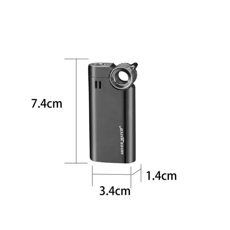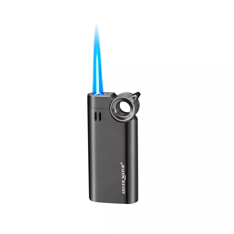 Запальничка Silver Match Ljubljana з струменевим полум'ям має тонкий закруглений корпус, похилу кнопку п'єзоелектричного запалювання і яскраве полум'я, що ідеально підходить для прикурювання сигар або сигарет.