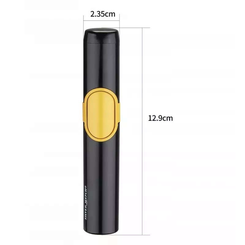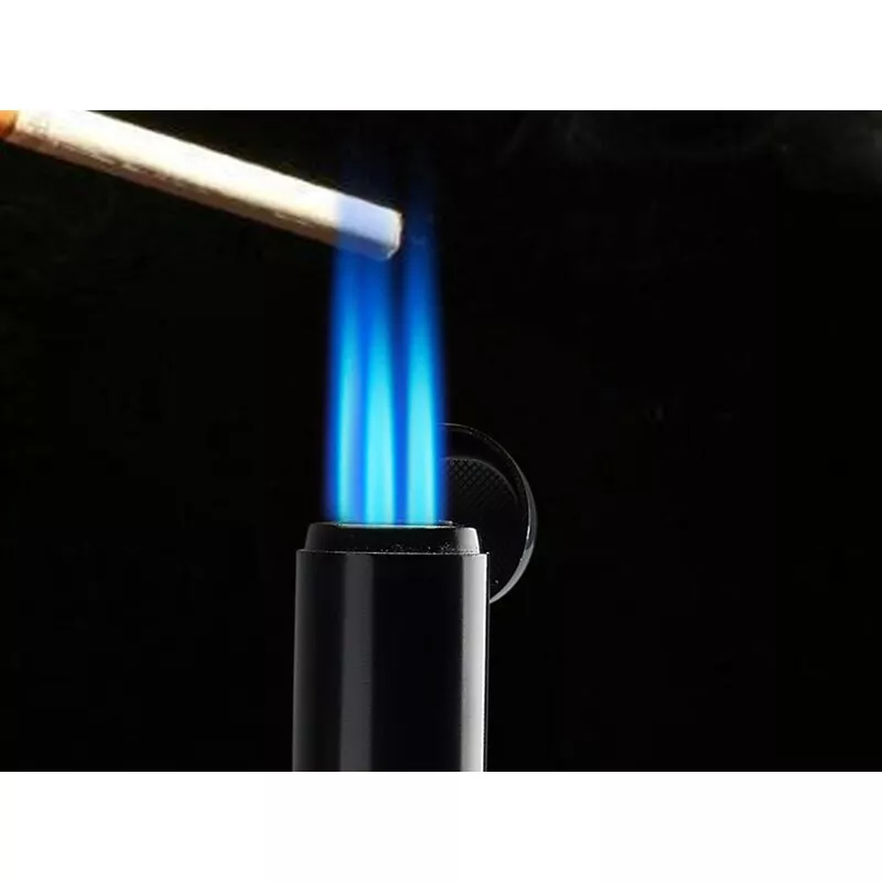 Ця запальничка має насамперед незвичайну форму - справжню сигару, вистота її 12,8 см, діаметр 2,2 см.Тяжка, надійна, з віконцем контролю газу та зручним регулюванням полум'я в денці запальнички. Порадує як любителя сигар, так і просто поціновувача прекрасних та стильних речей. Запальничка вітрозахисна, на три турбо полум'я. Струменеве полум'я потужне і частково невидиме, не підносити близько до обличчя та одягу. Струменеве полум'я складається з внутрішнього синього полум'я та прозорого зовнішнього. Займається електричною іскрою (п'єзоелемент).Має більшу витрату газу, ніж звичайні запальнички. Поставляється у гарному подарунковому футлярі.