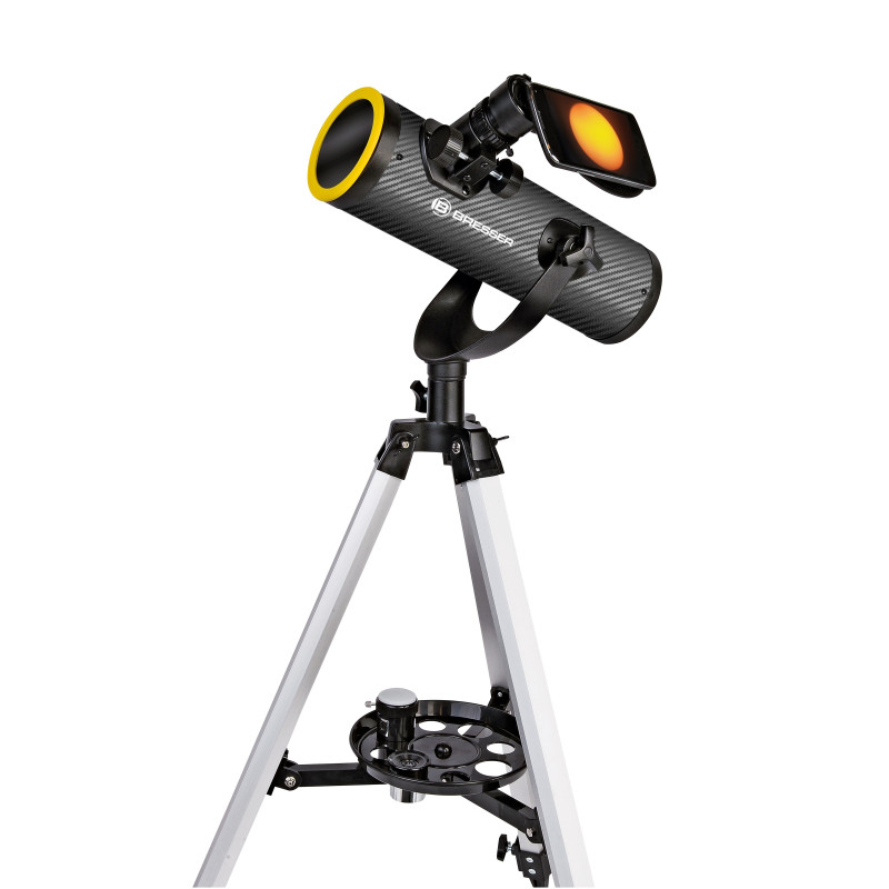 Компанія Bresser з гордістю представляє універсальний та унікальний у своєму роді телескоп Solarix 76/350 AZ (carbon). Тепер спостереження за сонячною активністю, денні ландшафтні спостереження та нічні спостереження зоряного неба можна проводити за допомогою одного телескопа Bresser Solarix 76/350 AZ (carbon). Важливим моментом є сертифікований сонячний фільтр, що дозволяє безпечно для очей спостерігати за Сонцем. Денні та нічні спостереження можна зняти на камеру смартфона, для чого в комплекті з телескопом постачається спеціальний адаптер. Дана модель має карбонове оздоблення труби і посилений профіль алюмінієвої триноги.