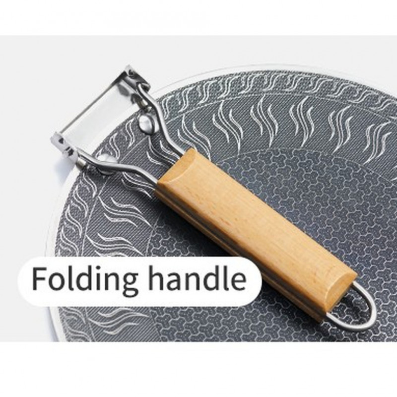 - Складана ручка з нержавіючої сталі 201 та бука. Сталева частина забезпечує жорсткість кріплення. Дерев'яна накладка з бука менше нагрівається, захищаючи від опіків.