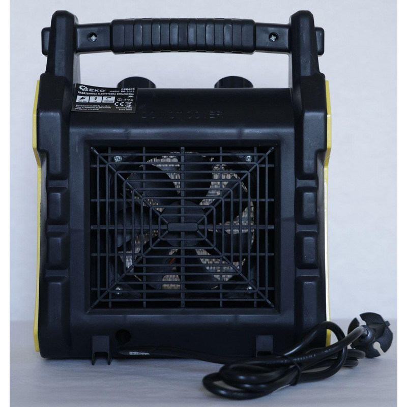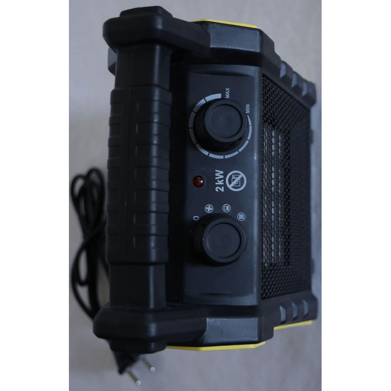 Електричний обігрівач потужністю 2кВт . Він оснащений керамічним нагрівальним елементом , який у поєднанні з сильним потоком повітря забезпечує швидкий нагрів приміщень, таких як магазини, майстерні, гаражі, домогосподарства тощо.