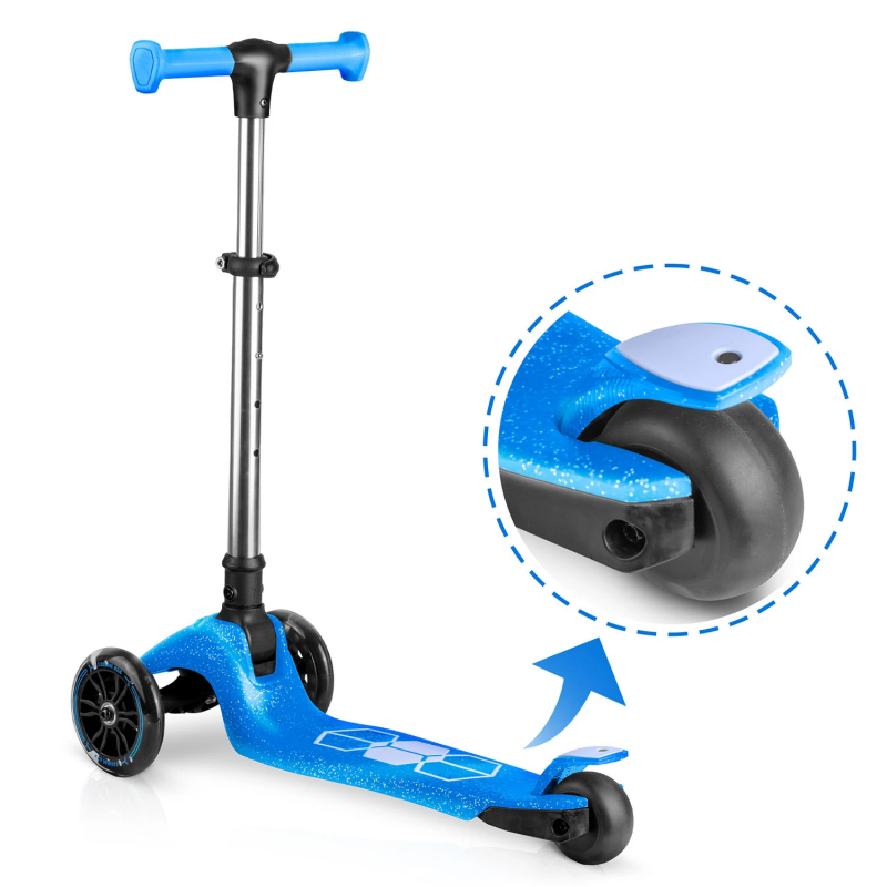 Триколісний дитячий самокат Ricokids Jelly. Сховані в платформі самоката світлодіодні панелі та світлові колеса додадуть трохи магії до звичайної гри. Керування здійснюється виключно за допомогою балансування тіла, без повороту керма. Достатньо злегка нахилитися в потрібну сторону і все. Дитина швидко освоює цю техніку їзди, а заодно тренує своє почуття рівноваги. Самокат, повертаючи, стабільно тримається у вертикальному положенні завдяки трьом колесам.