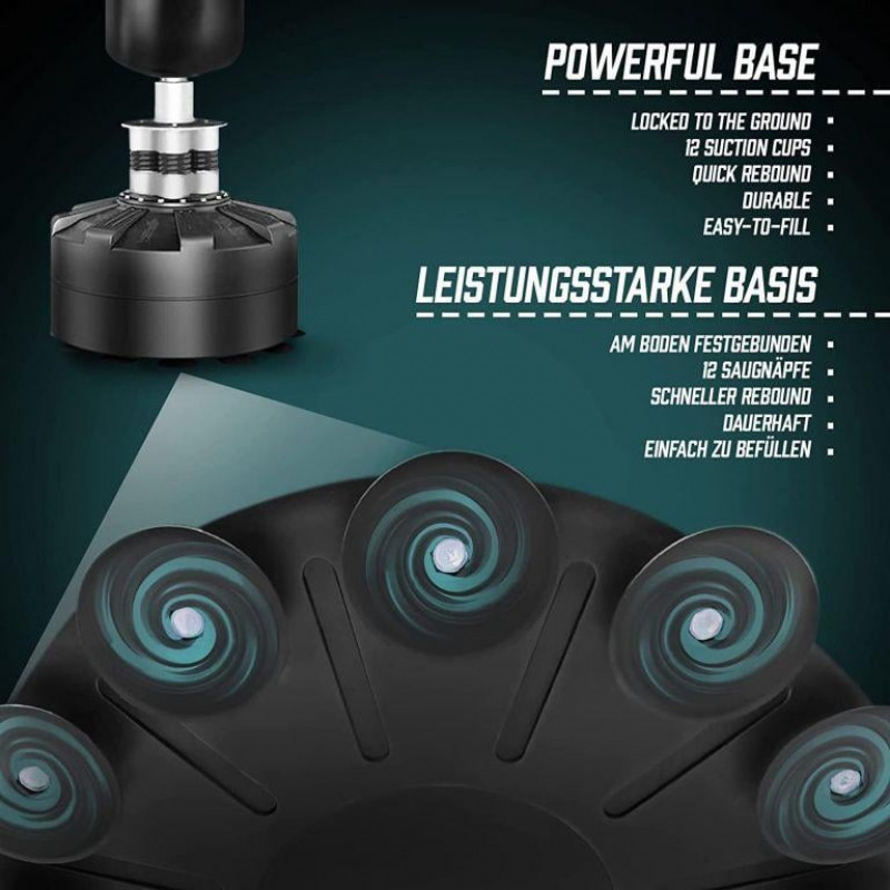 Окремо стоячий боксерський мішок призначений не лише для боксерів, але й ідеальне фітнес-обладнання для всіх спортсменів і любителів спорту, незалежно від того, чи є вони досвідченими у єдиноборствах чи просто хочуть розслабитися після довгого дня в офісі. Завдяки міцній, стабільній основі та надійному пружинному механізму цей боксерський мішок із підставкою є ідеальним рішенням, коли монтаж на стіні чи стелі неможливий. Він має міцну присоску з 12 присосками для встановлення.